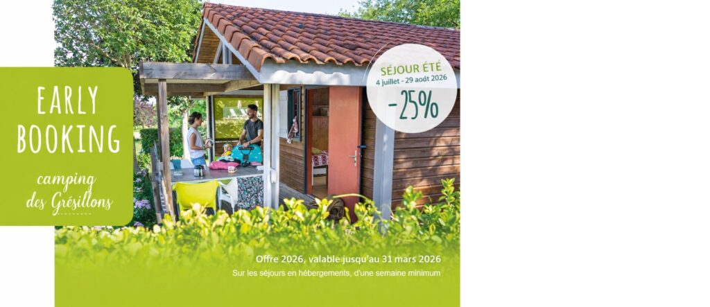 Le Camping Les Grésillons, niché au cœur de la Maine-et-Loire, à Saint-Georges-sur-Layon, est ravi d’annoncer l’ouverture de ses réservations pour la saison 2026 ! Pour célébrer cette nouvelle année, nous lançons notre promotion Early-Booking 2026 : 25% de réduction sur toutes les réservations effectuées du 5 janvier au 31 mars 2026 pour une semaine de location en hébergement (chalet) du 4 juillet au 29 août 2026. Je réserve !